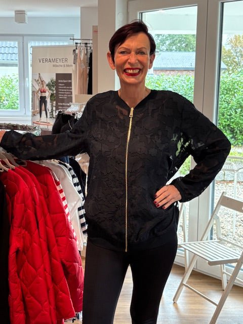Entdecke unseren zarten Blouson in elegantem Schwarz. Das florale Spitzen-Design verleiht dem Kleidungsstück eine romantische Note, während der leichte Stoff angenehme Tragekomfort garantiert. Die transparente Struktur sorgt für luftige Hautdurchblicke, ideal kombiniert mit einem Top oder T-Shirt darunter. Praktischer Reißverschluss, feminin geschnitten und perfekt für Frühjahr und Sommer. Vielseitig zu Jeans, Röcken oder Shorts – ein stilvoller Allrounder für jeden Anlass.