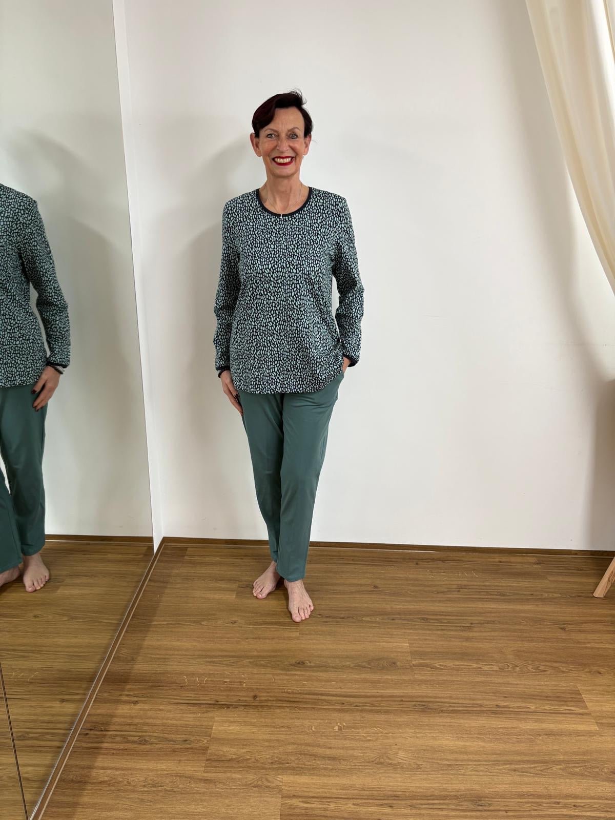 Der öko-zertifizierte Stoff ist wunderbar weich auf der Haut, atmungsaktiv und hautfreundlich – perfekt für alle, die Nachhaltigkeit und Komfort schätzen. Ob als stilvolle Homewear, lässiges Freizeitoberteil oder entspanntes Layering-Piece: Dieses Loungeoberteil passt sich Ihrem Alltag mühelos an.